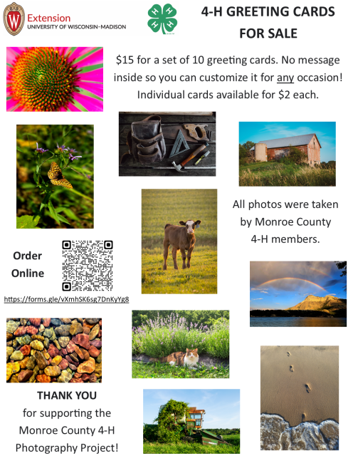 Cards will be sold at the Extension Office, 206 So. K Street, Sparta. Proceeds go towards the Monroe County 4-H Photography Project.